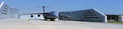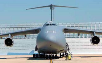 Like the C-5 Galaxy itself, the run-up enclosure is huge. At 365 feet deep, 314 feet wide and 58 feet high, it’s just the right size to accommodate the 250-foot long, 65-foot tall aircraft with a wingspan of 222 feet.