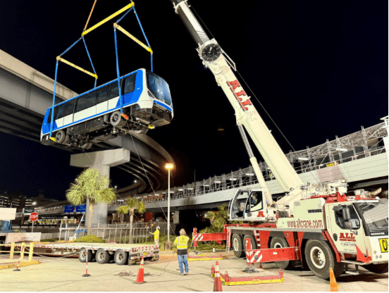 The first pair of brand-new shuttles arrived at Tampa International Airport’s Airside A early Wednesday morning, as crews worked overnight to lift the new cars onto the elevated guideway between the Airside and the Main Terminal.