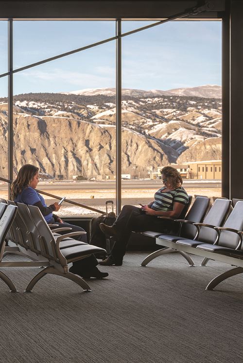 facts&figures Project: New Concourse Location: Eagle County (CO) Regional Airport Size: 65,000 sq. ft. Gates: 6 (4 with jet bridges; 2 outdoor) Ground Services/Baggage Handling Area: 17,336 sq. ft. Cost: $37 million Funding: Airport revenues; FAA grant Design/Build Partners: Gensler (design); Hensel Phelps (construction) Design Process: 6 months Construction: Groundbreaking in April 2018; Gates 1-4 substantially complete in June 2019; Gates 5-6 substantially complete in Dec. 2019 Features: Lounge area with fireplace, couches & rocking chairs with in-seat chargers; expanded concessions area; new paging system; animal relief area; elevators & escalators; touchless restroom fixtures; larger private nursing rooms Airside Elements: Common-use gate system; 4 heated jet bridges; 2 ground loading positions; 10 parking places for commercial aircraft Electrical/Fire Alarm: Encore Electric Mechanical/Plumbing: MTech Mechanical Low Voltage/Security: DMI Technologies (construction); BG Buildingworks (design) Fire Protection: Nothhaft Fire Protection Roofing/Metal Panels: Umbrella Roofing Glass & Glazing: Pinnacle Glass Structural Steel: WSI Iron Wood Ceilings: Razor Acoustics & Specialties Polished Concrete: Absolute Concrete Flooring Framing & Drywall: Peak Interiors Jetbridges: JBT AeroTech Technologies Baggage Handling System: Five Star Airport Alliance Trailers for Temporary Concourse: Williams Scotsman Holdroom Tandem Seating: Bernù Aero by Arconas Rocking Chairs: GT Rocker by Gus* Modern Holdroom Lounge Chairs: Element Lounge Chair by Andreu World Custom Wood Benches: Knapp Ranch |