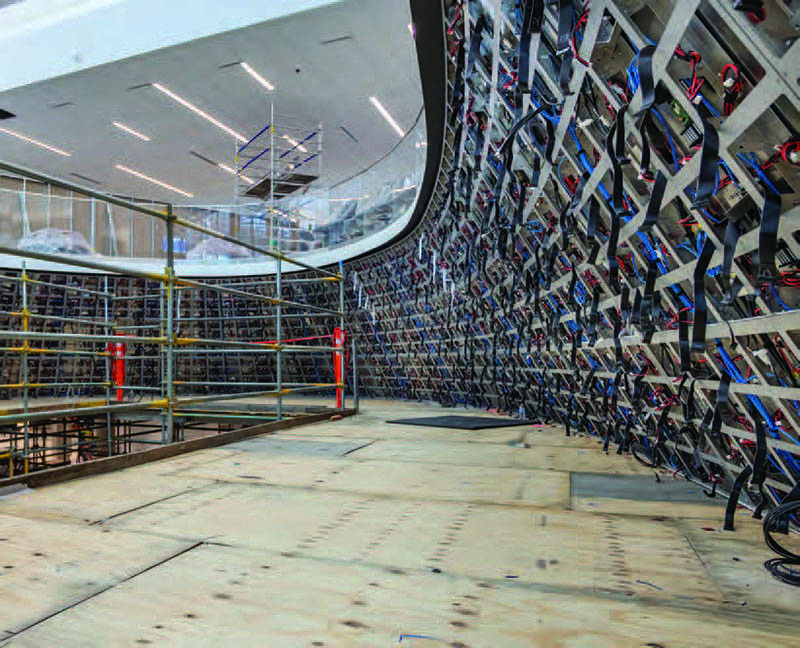 Behind the scenes, each section of the display connects to an extensive network with hundreds of power and data cables, redundant control wiring and six synchronized video servers. Any misalignment—even by a fraction of a second—could cause visible seams, so Ford AV coordinated with Nanolumens, Smart Monkeys and AV Stumpfl Pixera to create smooth playback across the entire curved surface.
