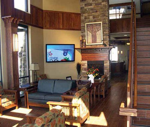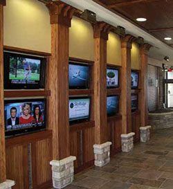 Visitors entering the main lobby are greeted with two banks of 14 integrated video screens mounted into stone and wood columns. The screens display advertising for local businesses and information about the region. Because they are digitally controlled by a vendor, content can be quickly changed to promote a special meeting or community event, Carroll notes.