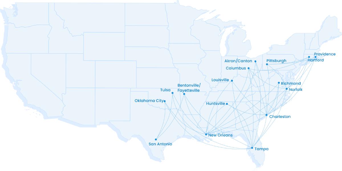 In addition to the New Orleans service, Breeze debuted its full network today, which includes 39 nonstop routes between 16 cities in the Southwest, Midwest, Southeast and Eastern US. Breeze is Mr. Neeleman’s fifth airline start-up, after JetBlue, Brazil’s Azul, Canada’s WestJet, and Utah-based Morris Air, which was later purchased by Southwest Airlines. Headquartered in Salt Lake City, UT, Breeze will focus most flights from four main airports: New Orleans, LA; Tampa, FL; Charleston, SC; and Norfolk, VA.