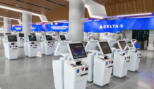The new consolidated lobby has 46 staffed counters and 32 self-serve kiosks to streamline the process of checking in and printing boarding passes. Behind the counters, a 250-foot digital backwall provides wayfinding information in English and Spanish, flight and gate information, and capacity levels in the Delta Sky Club.