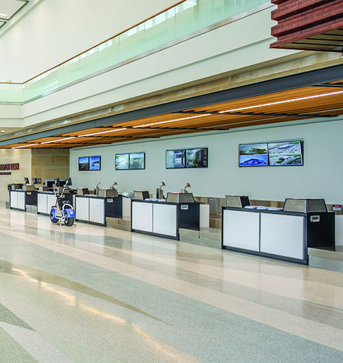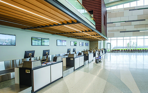 The 103,000-square-foot terminal has four gates with three passenger boarding bridges, and is designed to accommodate about 300 passengers per hour at peak use. The terminal opened with one TSA passenger checkpoint, but has the capacity and infrastructure to add two more. “We feel it’s going to be a great entrance to our community,” states Dudas.