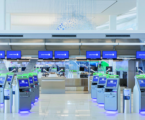 The new four-level Terminal B headhouse is home to Air Canada, American Airlines, Southwest Airlines and United Airlines. Common-use technology allows the carriers to share four check-in islands with staffed ticket counters, 105 self-service kiosks and a central bag drop. The carriers also share use of nine new baggage claim carousels.