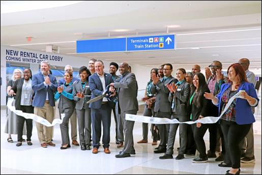 airport staff in celebrating the opening of the Pedestrian Bridge, an enhancement project at Terminal C.