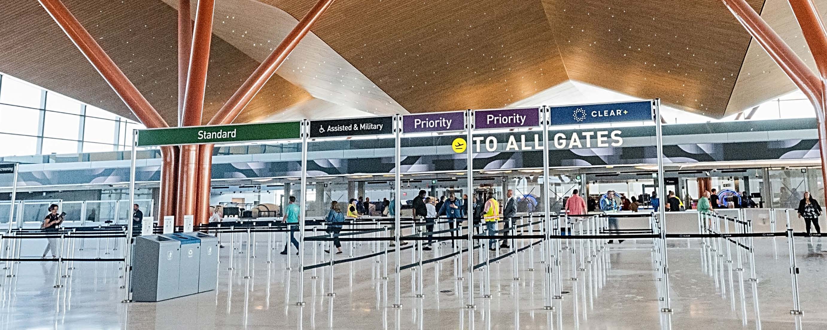 An undulating wood-look ceiling from Armstrong helps guide passengers to the new 12-lane TSA checkpoint.