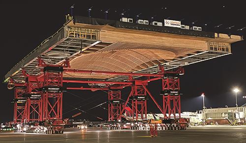 The roof is now being separated into 20 massive cassettes, each of which will be moved to the terminal at night with Mammoet Self-Propelled Modular Transporters. The largest cassette weighs in at a hefty 1.275 million pounds and measures 236 by 155 feet.