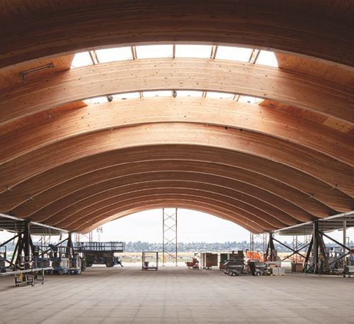 The new 9-acre structure will help double the square footage inside the terminal and includes 2.5 million board feet of Douglas fir lumber, with curves supported by glulam (glue-laminated) beams. Beams for the roof were manufactured offsite and then assembled on the airfield less than a mile from the main terminal, allowing the building to remain 100% operational throughout the process.