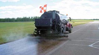OK with the FAA? Application of GSB-88 requires a request for modification of FAA specification P-609, which describes guidelines for sealcoats and bituminous surface treatments of airport pavements. Such permission, however, is not hard to obtain, says Dan Gee, owner of Gee Asphalt Systems. "I'm not aware of a single instance in which the FAA rejected our request to modify the specification," reports Gee. He further estimates that 40 million square yards of GSB have been applied at U.S. airports, and two-thirds of those projects received FAA funds. Fog seal, which is included in the P-609 spec, is a topcoat asphalt emulsion blended without aggregate. Its short-coming, says Gee, is that it does not penetrate and can be scraped off by plows and worn away by friction and oxidizes very quickly. GSB-88, he notes, penetrates the pavement surface and adds oils to the existing aggregates. When applied correctly, Gee explains, surface friction is maintained by using a micro textural slag material that is broadcast and bonded on top of the fresh oil. |