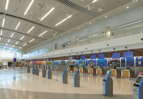 Airside, the curved form of the departures concourse echoes the curved form of an aircraft. Light and open spaces provide an airy ambiance, and walls are styled to represent coral reefs for a nautical theme. Stylized kites suspended in the arrivals space welcome and intuitively lead passengers to the Customs and Immigration areas, bag claim and the arrivals hall. On the departures side, birds unique to the island guide passengers to their gates.