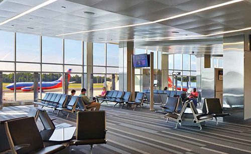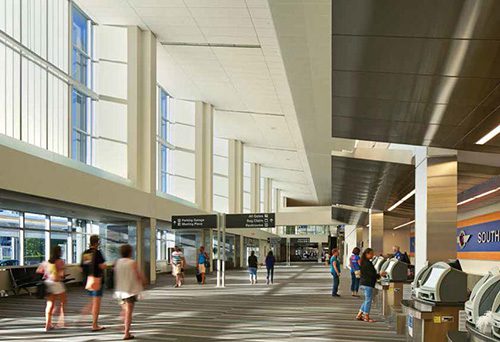 In the concourse area, raised ceilings and larger windows were added to create a more engaging and visually entertaining space for travelers. Walls and columns were moved to provide more open space throughout the building. Passengers can now access free Wi-Fi service throughout the terminal, and new seating includes power connections for recharging electronic devices.