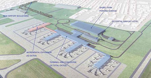 Potential complementary airport use includes a corporate campus office development, warehouses, manufacturing facilities and an intermodal logistics park that uses existing rail infrastructure. According to the Long-Term Infrastructure Development Plan, building a terminal on the north side will fill a regional void for large-scale development parcels.