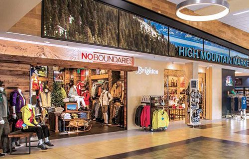 The Paradies Shops, RNO's retail operations manager, developed a master storefront with a mountain lodge feel. Four retail concepts are included behind the High Mountain Market storefront: No Boundaries, Brighton, CNBC News and InMotion Electronics. PGA Tour Shop and Adventure News are located in the pre-security area.