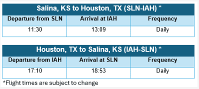 The schedule for the flights between the Salina Regional Airport and Houston Intercontinental is (all times local):