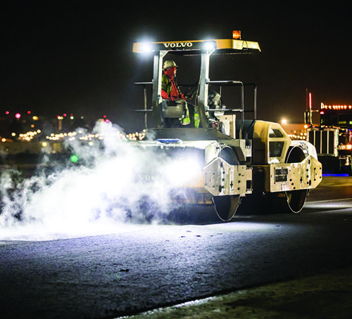A paver custom-built by Granite’s mechanics to be wide enough to cover the 20½-foot pass also expedited the process. After steamrollers compacted the new pavement, workers replaced the runway striping, cleaned the worksite and exited the field by 5 a.m.