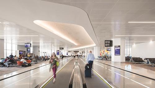 Mercer explains how it works: Soft carves in the ceiling use light to gently guide passengers down through the concourse, while a strong carve at the bend naturally pulls them around the corner and down the pier. A large commissioned art sculpture hanging within the carved ceiling acts as a key landmark. In the middle of the pier, carved boomerang shapes over the moving walkways are indirectly lit, creating soft, subtle directional encouragement. At the end of the pier, large sculpted carved clouds adorn the ceiling, creating a sense of arrival within the two-story volume and cueing passengers to slow down, relax and enjoy the available amenities.