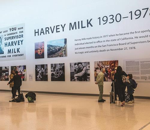 One example occurs in the boarding area, with a temporary 400-foot wall display dedicated to the life and times of the terminal’s namesake, LGBTQ+ leader and local politician Harvey Milk. “It’s a cool moment for passengers that reflects the culture and history of San Francisco and lets them know a little bit about why the terminal was named after him,” says Mosqueda. The text and images of the exhibit, Harvey Milk: Messenger of Hope, will be on display for at least two years. The check-in lobby includes a more permanent display memorializing his legacy.