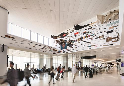 Local art throughout the terminal fulfills both aesthetic and wayfinding goals. “Marrying of the art and the space itself was quite successful,” notes Ryan Fetters, a Gensler principal. “They fit in nicely within the space so they don’t look like they were just tacked on at the end.”