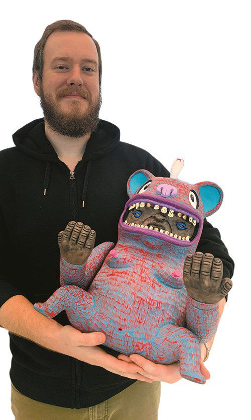Rimel used a foundation of polymer clay and ceramics to create a unique cast of characters with broad appeal. “Everyone can relate to toys, whether you buy them for your kids or played with them growing up,” says the sculptor. “This allows the art to be disarming and approachable for all age groups and backgrounds. Even if you don’t take the time to closely examine the pieces, they are based on bright colors and toy-like features, which always engage viewers and bring a smile to their faces.”