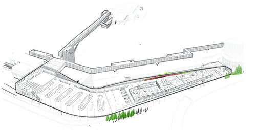 In the Grand Hall, the tilt of the roof is designed to resemble an airplane landing. It also brings in natural light and maximizes views to guide travelers through the facility.
