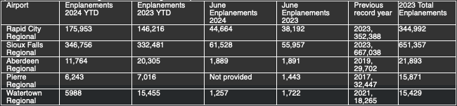 The number of airline enplanements in Rapid City and Sioux Falls during the first half of the year totaled 522,709, surpassing the previous record of 478,697 – an increase of 8.4% from 2023 year-to-date.