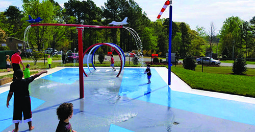 Built on property vacated by the Civil Air Patrol, the seven-acre park features two playground areas with aviation-themed equipment, a multipurpose athletic field, a splash pad, fitness equipment, two pavilion shelters, picnic tables, restrooms facilities and a paved walking path.