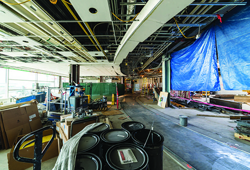 For example, crews built out the 100,000-square-foot Node C atrium in six major phases that spanned nearly two years. During renovations, the communications department implemented a graphics program to decorate the hoarding (construction partitions) used to block off areas under construction and reroute passenger flow. Instead of passing by plain white drywall, travelers saw messages designed to remind them that renovations were occurring to improve their experience. “It was a good blank slate to provide information, and they were usually colorful images,” Crepinsek notes.