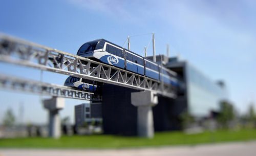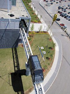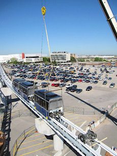 The system includes two six-car trains that run independently on two elevated tracks spanning .9 mile. Each car holds 36 people, and the system is capable of moving 2,150 passengers/hour/direction. Round trip travel time is about eight minutes.