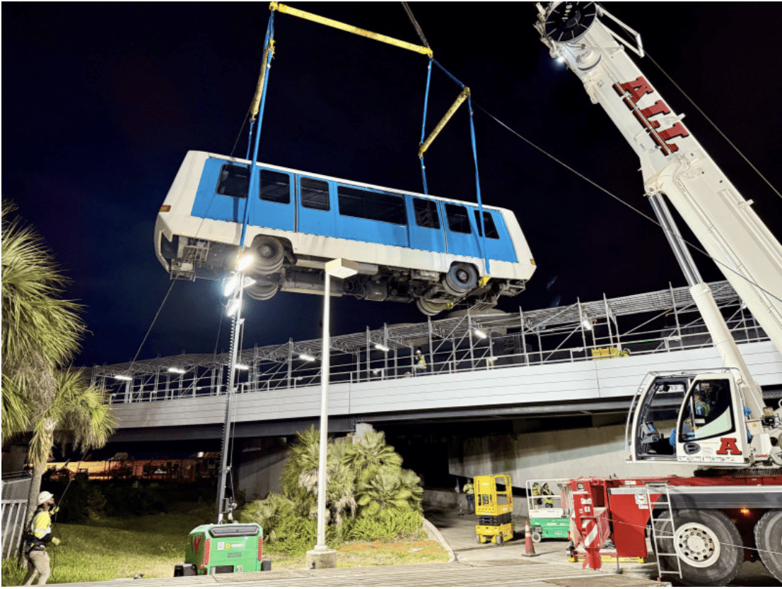 Tampa International Airport’s Airside A Blue shuttle cars were officially retired this week when they were removed from their elevated guideway between the Main Terminal and the Airside to make way for their modern replacements.