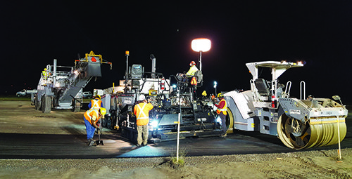 During peak construction in summer 2016, the project required up to 45 loads of asphalt per night. “Those trucks would have been rumbling through the streets and community,” he comments. The contractor further minimized truck movements by staging and stockpiling material at the 210-acre airport.