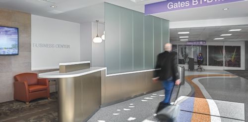 The terrazzo flooring not only provides a lighter, brighter space, but also represents the region and helps guide travelers through the airport. The color combination of browns and purples plays to desert sunset colors; the pattern, which mimics a river cutting through the desert floor, is designed to intuitively lead passengers from the terminal to the concourse.