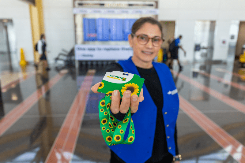 A Travelers Aid volunteer holds a Hidden Disabilities Sunflower lanyard at Reagan National Airport