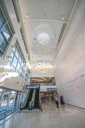 To be sure, ELP’s new three-story facility was designed to get customers in and out quickly and expedite the turnaround process for rental agencies. However, it was also designed with a host of finishing touches aimed purely at visual appeal. The 9,000-square-foot atrium lobby features an eye-catching sculpture called Radiance hanging from the ceiling. Artists Norman Lee and Shane Allbritton created the artwork using hundreds of acrylic shapes based on traditional patterns of ethnic groups that have contributed to the city’s diverse cultural heritage. “Depending on the time of day, light throws different colors into different places-it looks gorgeous,” says Scott Goldstein, director of planning and programming for Enterprise Holdings, the rental car conglomerate that includes Enterprise, Alamo and National. A terrazzo floor design created by Mitsumasa Overstreet helps guide customers into the CONRAC from the airport. The design, titled The River/El Rio, flows from the terminal through a covered walkway and into the new facility. Designers from Demattei Wong Architecture even added special visual touches in the structure’s elevator. Light boxes on three of the walls display brilliant photographs of the local scenic vistas passengers would actually see if the new structure weren’t there. |