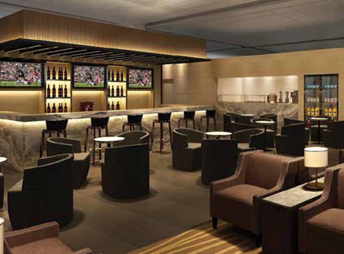 Lounge amenities include a tended bar, a dinning area with hot and cold food, private work pods and a general seating area with electrical outlets for charging electronics at each seat.